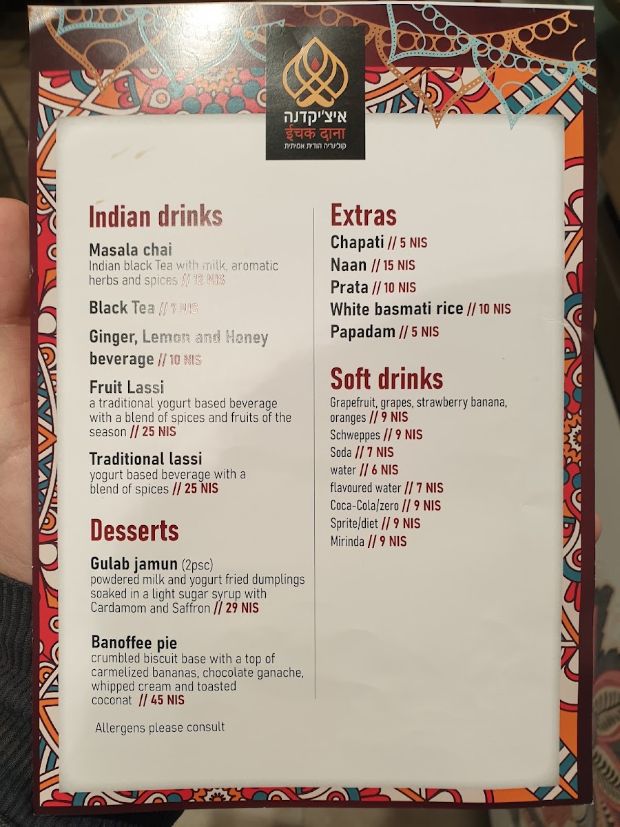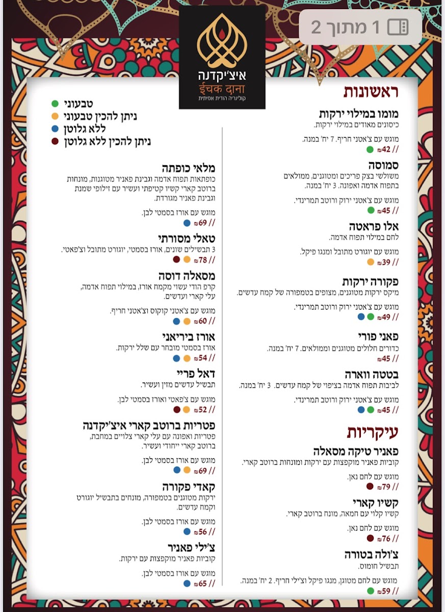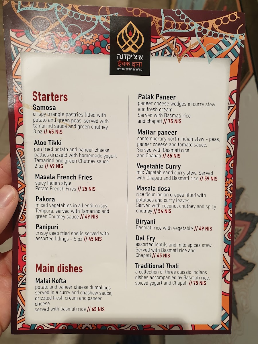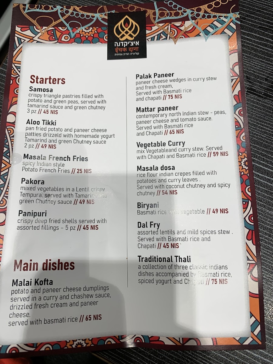 The menu at Ichikidana Indian Cuisine feels carefully curated to showcase the comfort, depth, and diversity of Indian cooking, balancing familiar favorites with regional specialties. Creamy vegetarian classics like Palak Paneer and Paneer Tikka Masala & Naan highlight the restaurant’s strength in rich, spiced gravies paired with soft, satisfying breads, while dishes such as מלאי כופתה and ירקות בקארי lean into a gentler, aromatic profile that still feels indulgent. For those who enjoy variety in a single sitting, טאלי and דיילי פארי bring together multiple components, offering a well-rounded taste of the kitchen’s range. Street-food inspirations are also well represented, from crispy פקורה ירקות and Aloo Tikki to the tangy, playful bite of Panipuri, alongside both Samosa and סמוסה, which add a familiar crunch and comforting spice. South Indian influences stand out through lighter, fermented dishes such as Idlii, אידלי סמבר, and מסאלה דוסה, providing contrast to heartier options like אורז ביריאני, which delivers layered spices and satisfying depth. The beverage and dessert selections round out the experience thoughtfully, with Masala Chai, צ'אי מסאלה, and Mango Lassi offering classic refreshment, while Gulab Jamun delivers a sweet, syrupy finish. Overall, the menu comes together as a cohesive summary of Indian comfort food, giving diners multiple ways to explore flavors, textures, and traditions without straying beyond a focused, well-defined culinary identity.