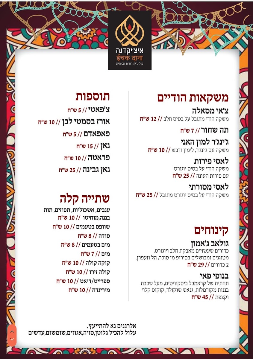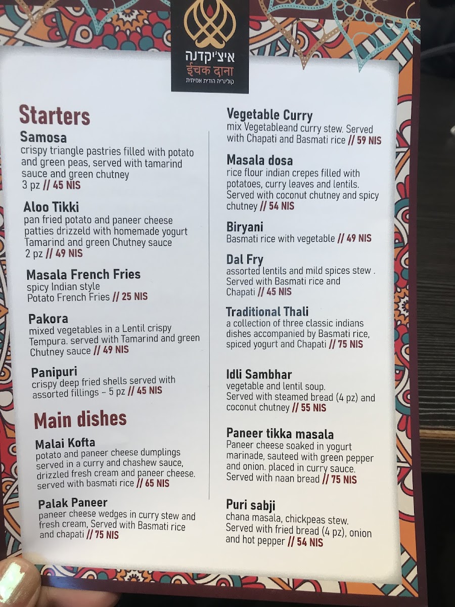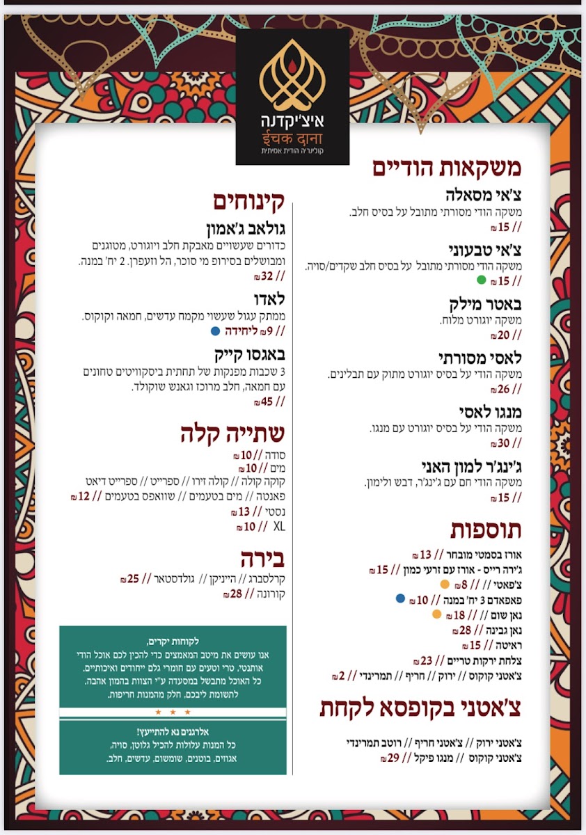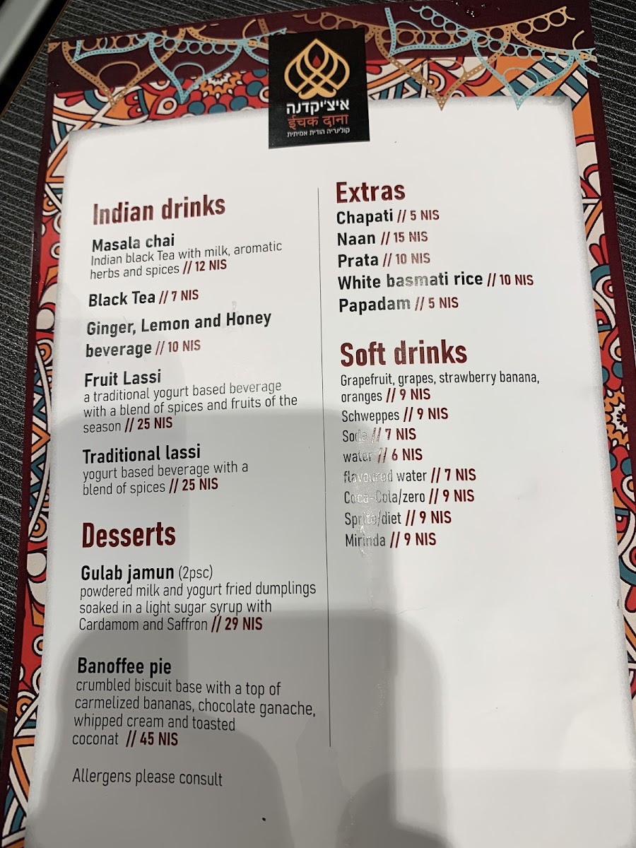 The menu at Ichikidana Indian Cuisine feels carefully curated to showcase the comfort, depth, and diversity of Indian cooking, balancing familiar favorites with regional specialties. Creamy vegetarian classics like Palak Paneer and Paneer Tikka Masala & Naan highlight the restaurant’s strength in rich, spiced gravies paired with soft, satisfying breads, while dishes such as מלאי כופתה and ירקות בקארי lean into a gentler, aromatic profile that still feels indulgent. For those who enjoy variety in a single sitting, טאלי and דיילי פארי bring together multiple components, offering a well-rounded taste of the kitchen’s range. Street-food inspirations are also well represented, from crispy פקורה ירקות and Aloo Tikki to the tangy, playful bite of Panipuri, alongside both Samosa and סמוסה, which add a familiar crunch and comforting spice. South Indian influences stand out through lighter, fermented dishes such as Idlii, אידלי סמבר, and מסאלה דוסה, providing contrast to heartier options like אורז ביריאני, which delivers layered spices and satisfying depth. The beverage and dessert selections round out the experience thoughtfully, with Masala Chai, צ'אי מסאלה, and Mango Lassi offering classic refreshment, while Gulab Jamun delivers a sweet, syrupy finish. Overall, the menu comes together as a cohesive summary of Indian comfort food, giving diners multiple ways to explore flavors, textures, and traditions without straying beyond a focused, well-defined culinary identity.